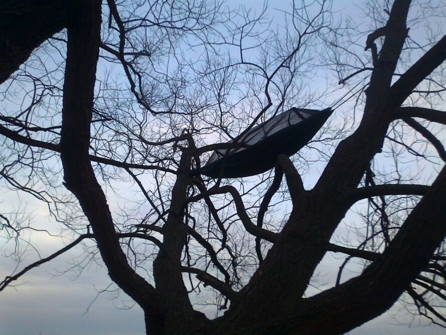 Náš spolu-hamakář Josef nám poslal tuto zajímavou a inspirativní fotografii. Je na ní jeho vysoko, v korunách stromů zavěšená hamaka Travel/Bivi. Josef je rád v lese v bezpečí, především před zlými lidmi a proto pečlivě vybírá místa pro svůj bivak. Hamaka mu dala možnost zavěsit svůj bivak vysoko nad běžné pohledy očí a minimalizovat tak možnost objevení.